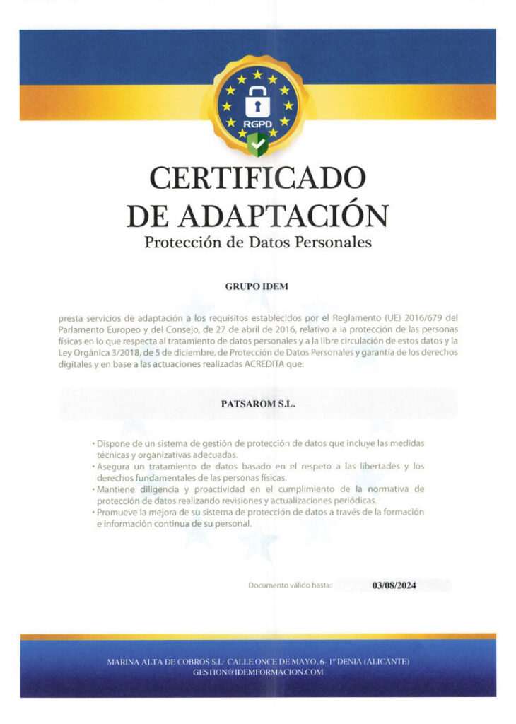 El responsable del tratamiento de los datos personales recogidos en RGI es: PATSAROM S.L. con CIF: B05304316